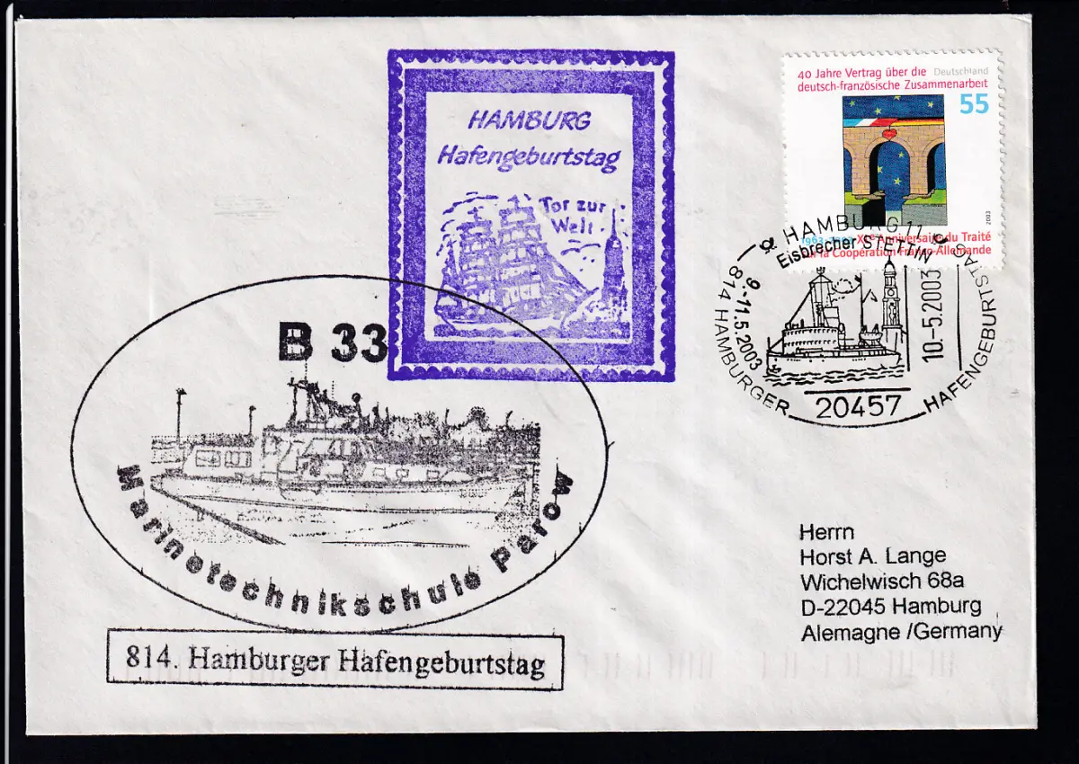 HAMBURG 11 20457 814. HAMBURGER HAFENGEBURTSTAG 9.-11.5.2003 EISBRECHER STETTIN 10.5.2003 + Cacher auf Brief