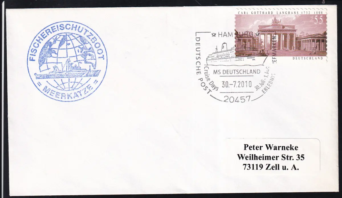 HAMBURG 20457 DEUTSCHE POST ERLEBNIS BRIEFMARKEN CRUISE DAYS 30.Juli-1.Aug. MS DEUTSCHLAND 30.7.2010 + Cachet auf Brief