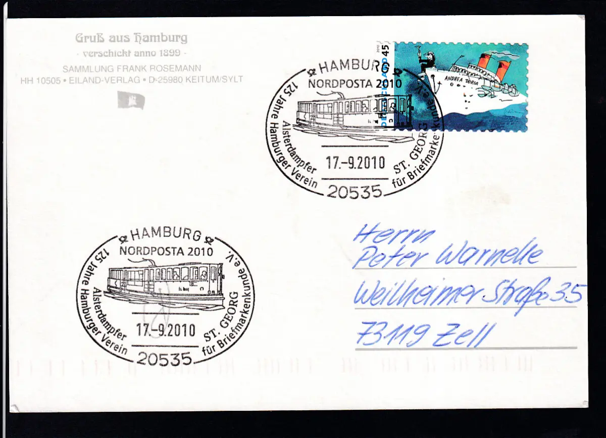 HAMBURG 20535 125 Jahre Hamburger Verein für Briefmarkenkunde e.VB. NORDPOSTA 2010 Alsterdampfer ST. GEORG 17.9.2010 auf CAK