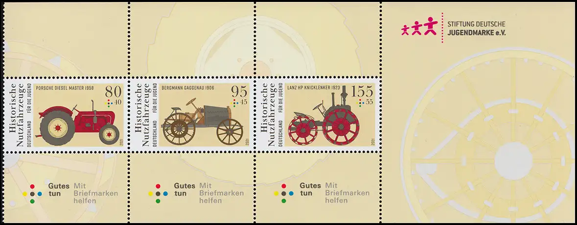 Jugendmarken: Historische Nutzfahrzeuge mit 3618 Porsche Diesel Master 1958, 3619 Bergmann Gaggenau 1906, 3620 Lanz HB Knicklenker 1923