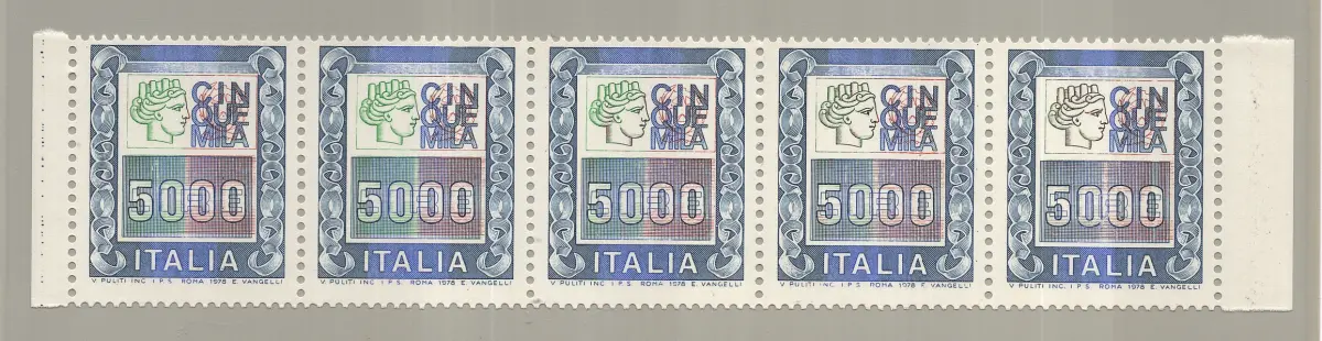 MNH - Vollgummi - HOHER WERT 5000 L. FÜNFSTREIFEN Ein Exemplar mit schwarzem statt grünem Kopf - UNTERTEIL BLATT Cod. ITAV_1542