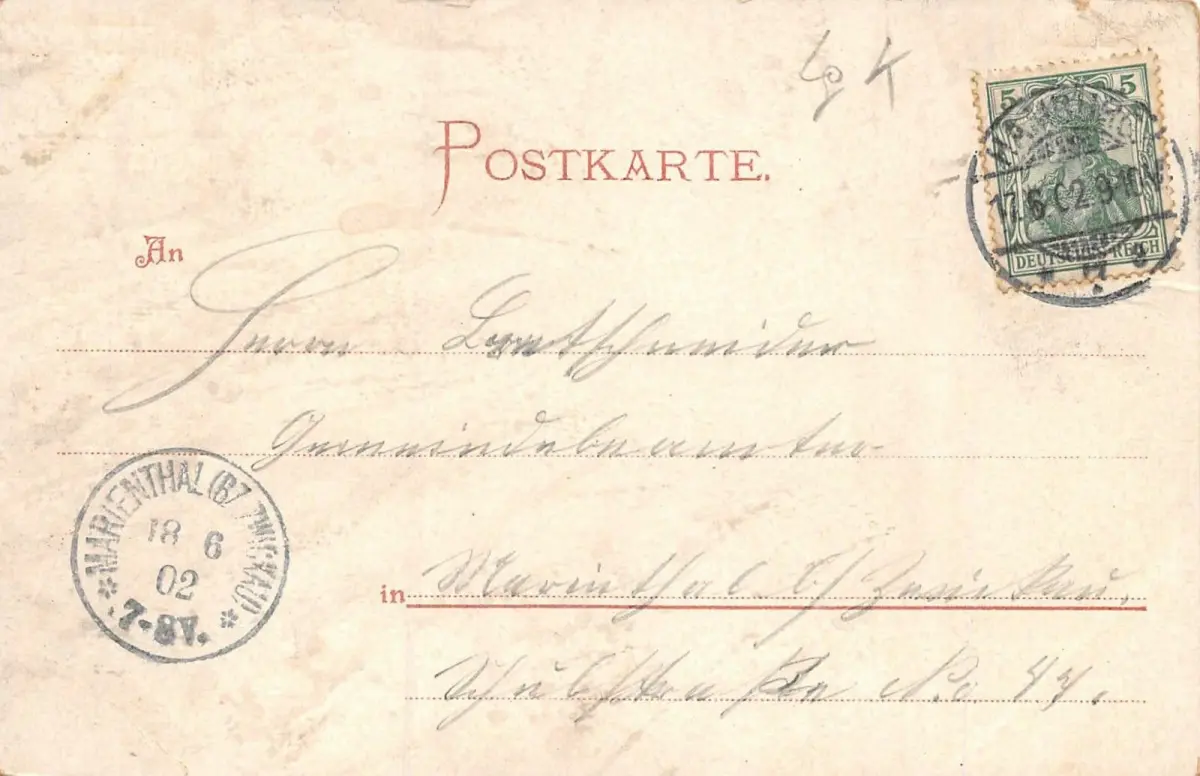 Rückseite: gelaufen 1902 von Hamburg nach Marienthal