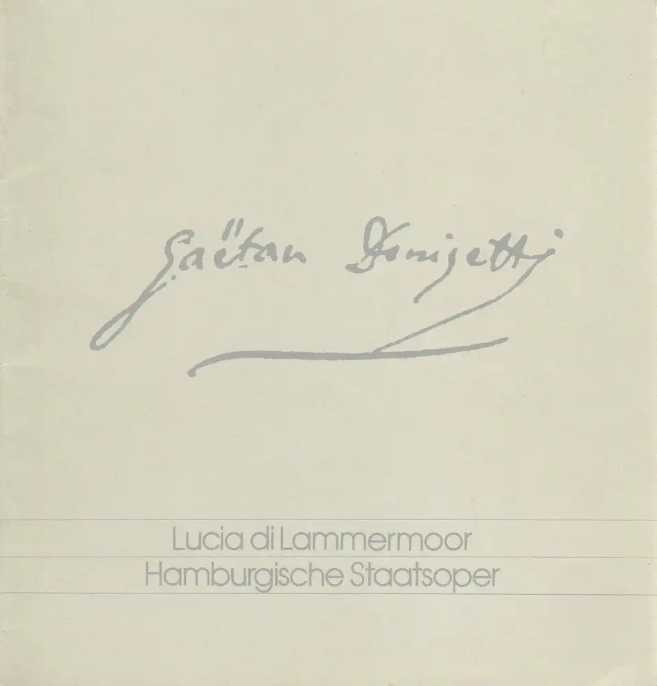 Oper, in italienischer Sprache. Nach Walter Scott von Salvatore Cammarano. Musikalische Leitung: Paolo Peloso. Inszenierung: Peter Beauvais. Ausstattung: Jürgen Rose. Chöre: Jürgen Luhn. Spielleitung: Rainer Bunzel. Mitwirkende: Vincente Sardinero, Christina Deutekom, Alfredo Kraus, Thomas Herndon, Harald Stamm, Olive Fredricks, Heinz Kruse. - Theaterprogramm, Opernprogramm, Ballettprogramm, Musicalprogramm, Konzertprogramm, Theatermemorabilia, Programmhefte Sammlung, deutsche Theatergeschichte.
