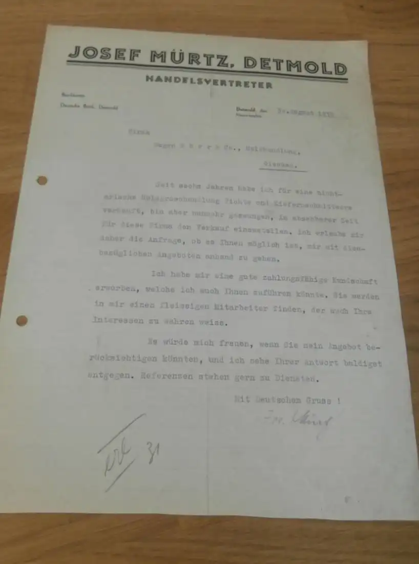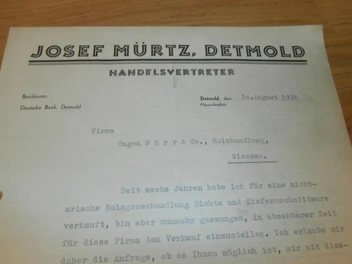 Handelsvertreter - Josef Mürtz in Detmold , 1938 , altes Dokument !!!