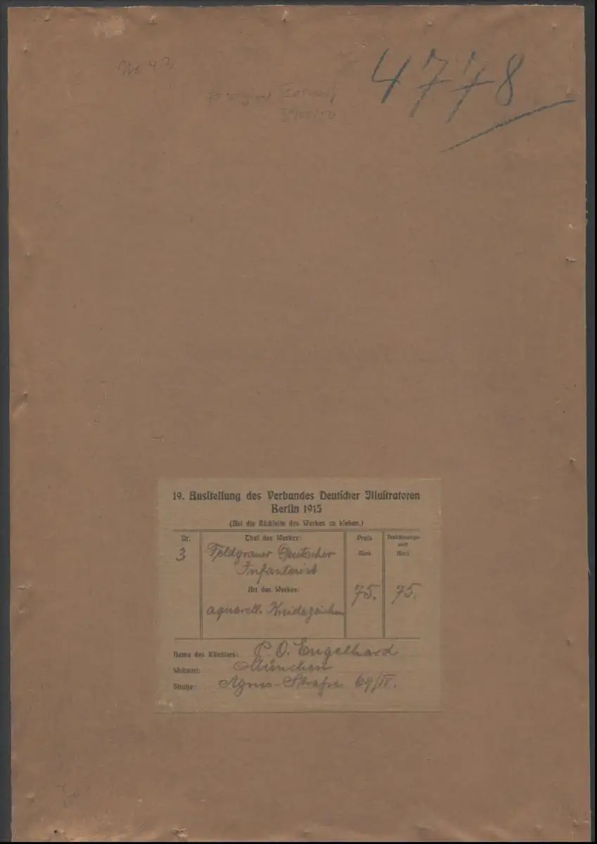 Maße: 43cm x 29,5cm, im Bild signiert P.O. Engelhard 1914, Rückseitig Papieraufkleber: 19. Ausstellung des Verbandes Deutscher Illustratoren Berlin 1915, Aquarell montiert auf Karton, leicht gebräunt, Abriebspuren links oben und rechts unten, guter Zustand