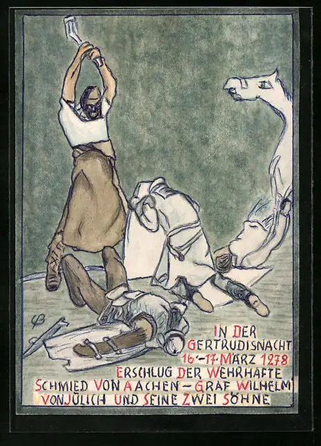 Handzeichnung / Ansichtskarten-Entwurf Aachen, Der wehrhafte Schmied
