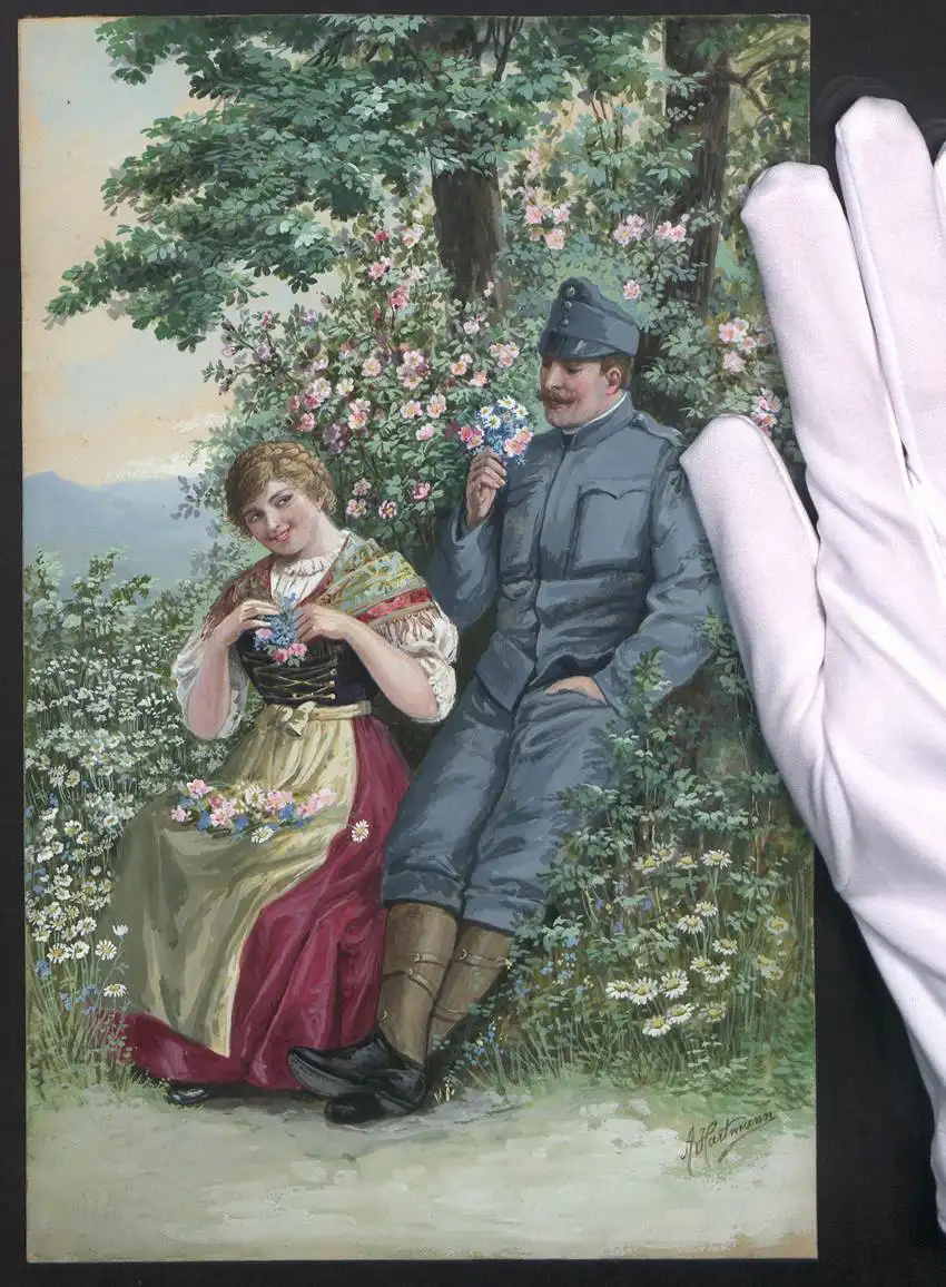 Handzeichnung / Ansichtskarten-Entwurf Künstler-AK sign. A. Hartmann, Soldat in Feldgrau mit seiner Geliebten