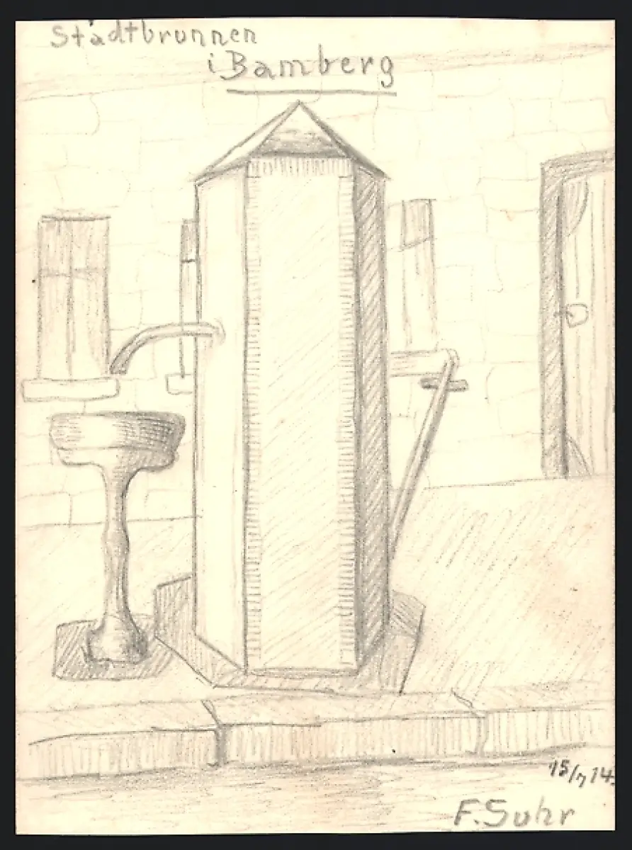 Handzeichnung F. Suhr, Bamberg, der Stadtbrunnen, 1914