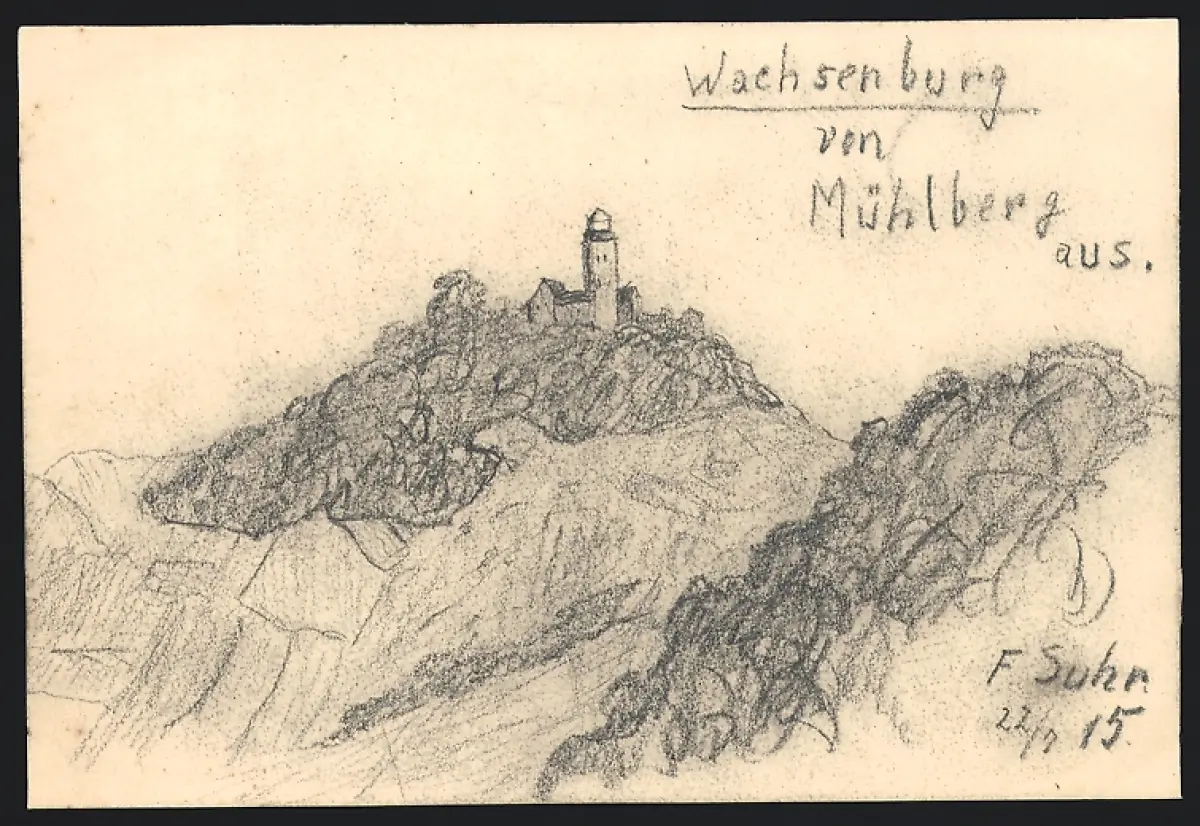 Handzeichnung F. Suhr, Mühlberg / Thüringen, Blick nach der Wachsenburg, 1915
