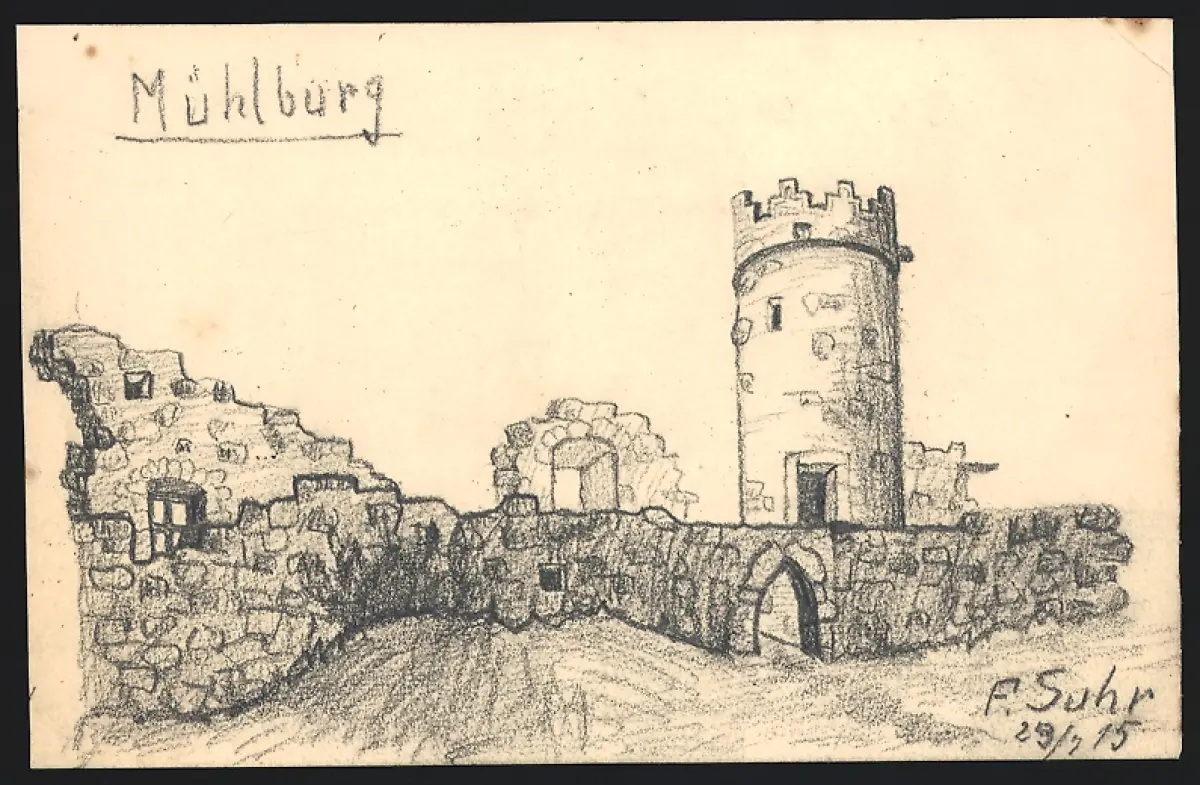 Handzeichnung F. Suhr, Mühlberg / Thüringen, auf der Ruine Mühlburg