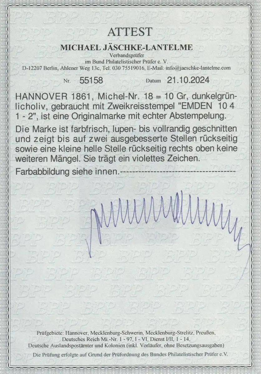 Hannover: Nr. 18 gestempelt Emden, Attest Jäschke-L. BPP
