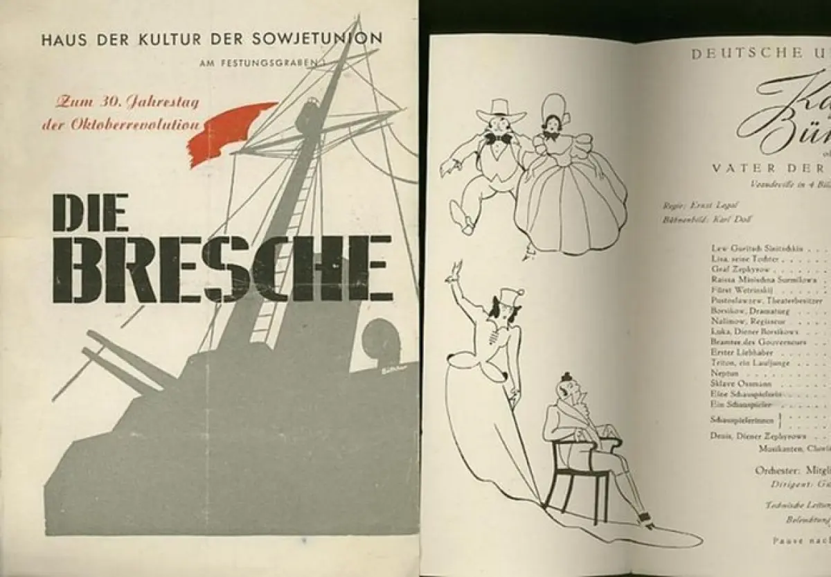 Haus der Kultur der Sowjetunion, Berlin. - Boris Lawrenjow: Programmheft zu: Die Bresche. - Regie: Heinz Wolfgang Litten, mit u. a.: Franz Nicklisch, Ernst Sattler, Gerhard Bienert, Herbert Köfer, Curt Trepte, Charlotte Ritter, Maria Griem / weiterer Inha