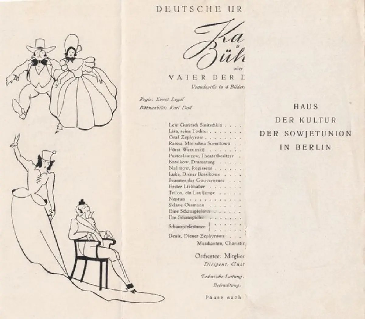 Haus der Kultur der Sowjetunion, Berlin. - Dimitrij Lenskij: Programmzettel zu: Kabale und Bühne oder- Vater der Debütantin. DEUTSCHE URAUFFÜHRUNG. Veaudeville von Dimitrij Lenskij. - Inszenierung: Ernst Legal, Musik: Joe Edwards. Mit u. a.: Ernst Legal,