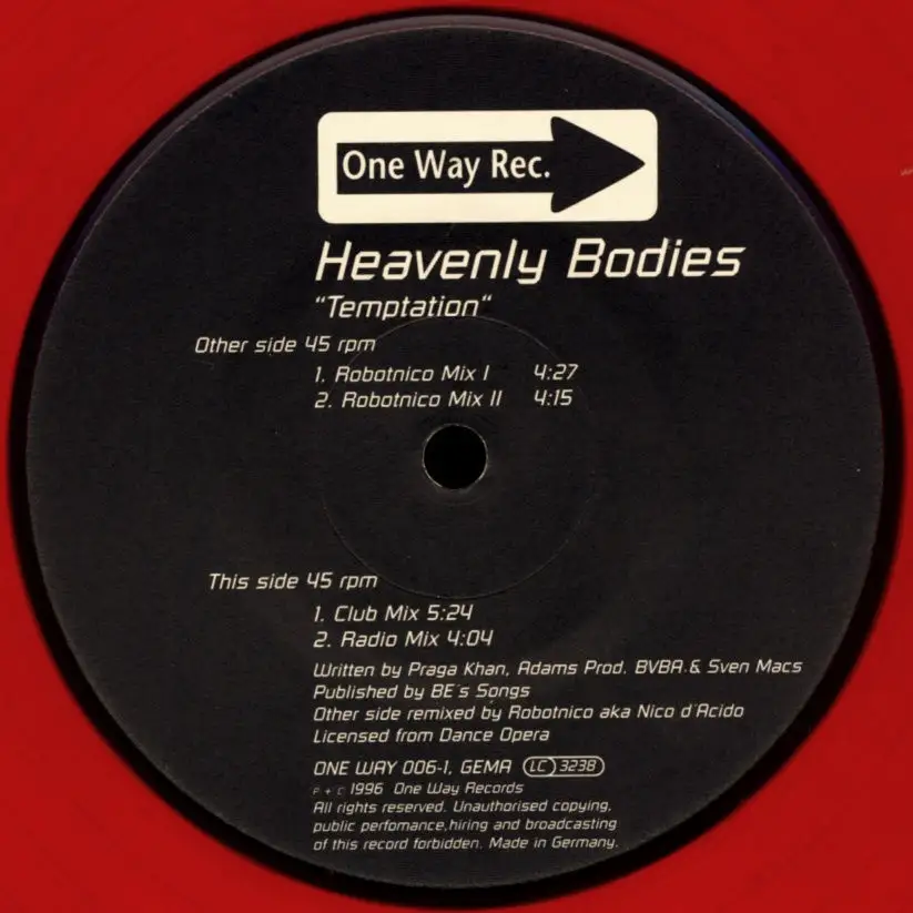 12" Maxi Heavenly Bodies - Temptation, red vinyl, Zustand Platte VG+ Hülle VG+; Made in Germany 1996 One Way Records 006-1, Tracks Robotnico Mix I 4:27, Robotnico Mix II 4:15, Club Mix 5:24, Radio Mix 4:04
