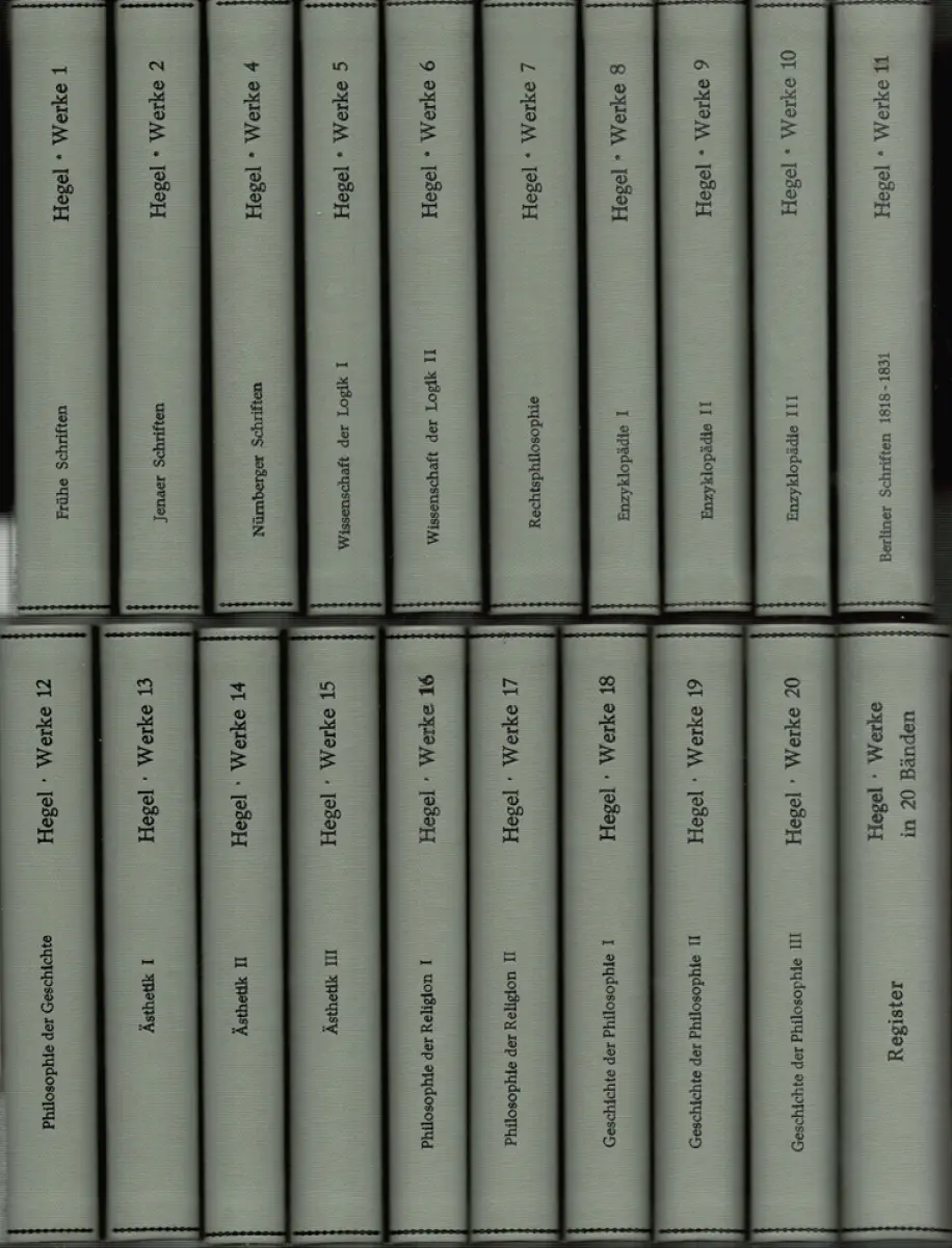 [1] Frühe Schriften / [2] Jenaer Schriften 1801-1807 / [3] Phänomenologie des Geistes / [4] Nürnberger und Heidelberger Schriften (1808-1817) / [5-6] Die Wissenschaft der Logik I-II / [7] Grundlinien der Philosophie des Rechts oder Naturrecht und Staatwissenschaft im Grundrisse / [8-10] Enzyklopädie der philosophischen Wissenschaften im Grundrisse (1830). Tl. 1: Die Wissenschaft der Logik; Tl. 2: Die Naturphilosophie; Tl. 3: Die Philosophie des Geistes / [11] Berliner Schriften 1818-1831. / [12] Vorlesungen über die Philosophie der Geschichte. / [13-15] Vorlesungen über die Ästhetik I-III, / [16-17] Vorlesungen über die Philosophie der Religion I / [17] Vorlesungen über die Philosophie der Religion II: Vorlesungen über die Beweise vom Dasein Gottes. / [18-20] Vorlesungen über die Geschichte der Philosophie I-III. / Registerband. Von Helmut Reinicke. - Gepflegt und sauber, wie ungelesen