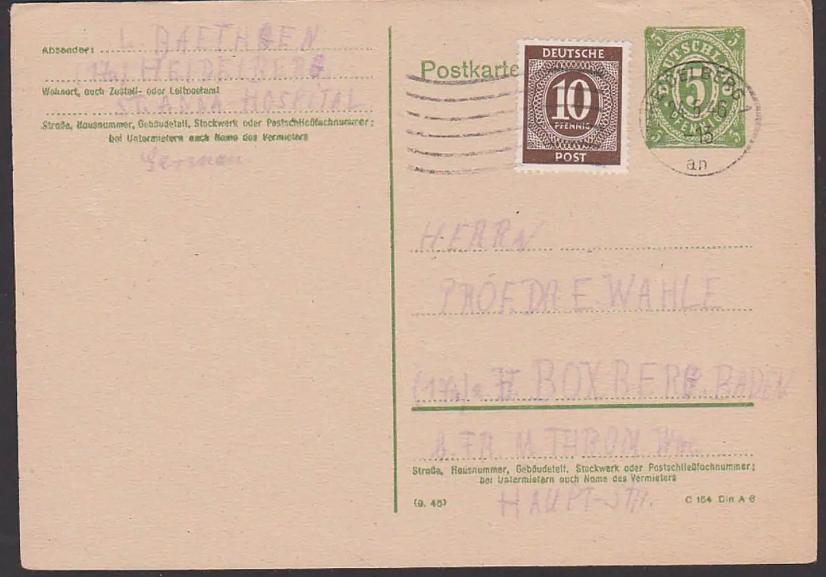 Heidelberg 1946 5 Pf. Aushilfs-GA mit Zusatzfrankatur nach Boxberg Baden