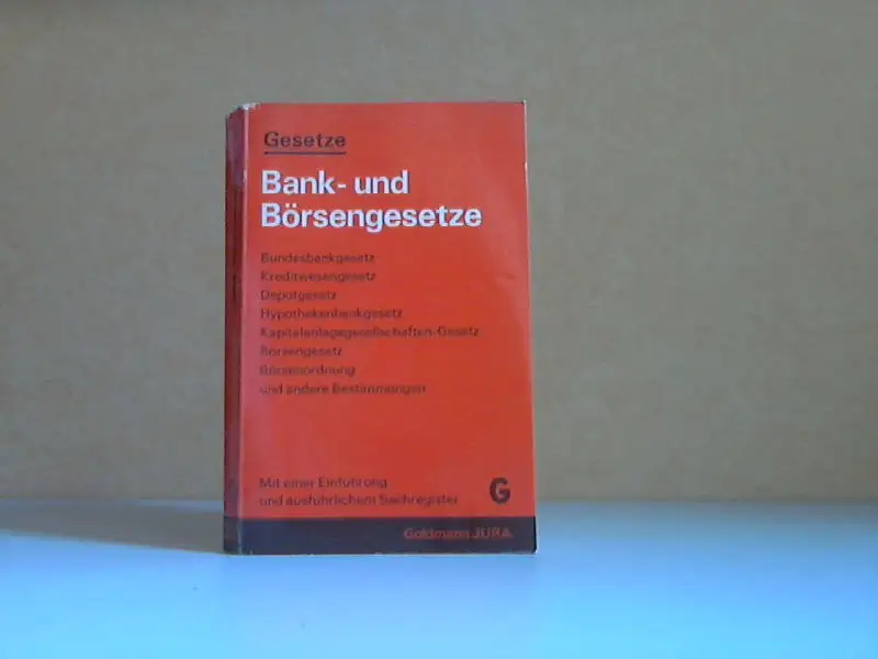 die Seiten sind altersbedingt gebräunt, EInbandkanten mit Bestoßungen, aus dem Inhalt: Gesetz über die Deutsche Bundesbank - Gesetz über das Kreditwesen - Grundsätze über das Eigenkapital und die Liquidität der Kreditinstitute - Anweisung der Deutschen Bundesbank über Mindestreserven (AMR) - Monatliche Bilanzstatistik - Gesetz über die Verwahrung und Anschaffung von Wertpapieren (Depotgesetz) - Hypothekenbankgesetz - Fünftes Gesetz zur Änderung und Ergänzung des Hypothekenbankgesetzes - Gesetz über Kapitalanlagegesellschaften - Börsengesetz - Börsenordnung für die Bayerische Wertpapierbörse in München - Scheckgesetz - Wechselgesetz - Schlagwort-Register Beschreibung vom Antiquariat Ardelt 3f4b ISBN-Nummer: 344208041X Antiquariat Ardelt