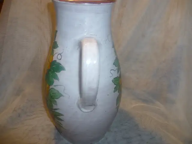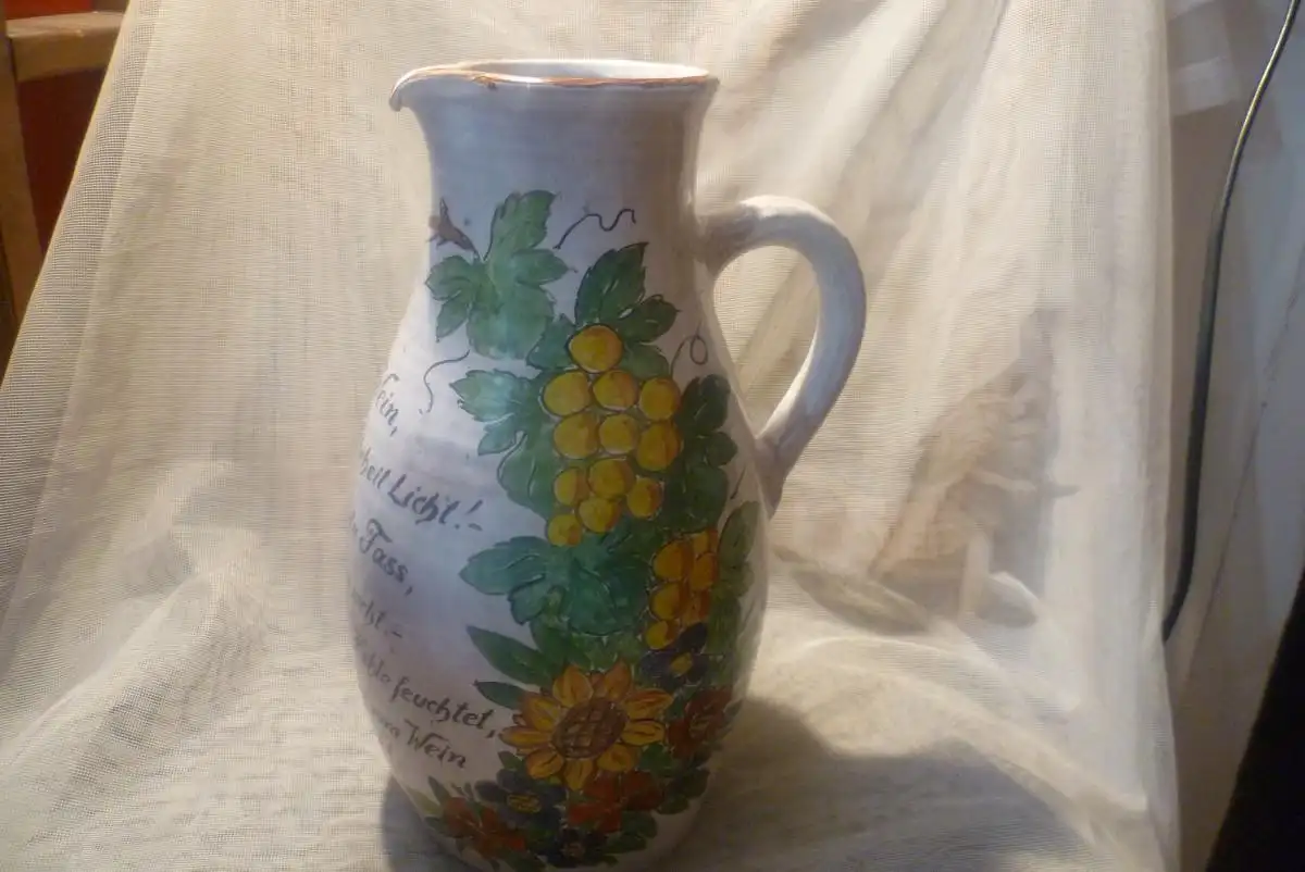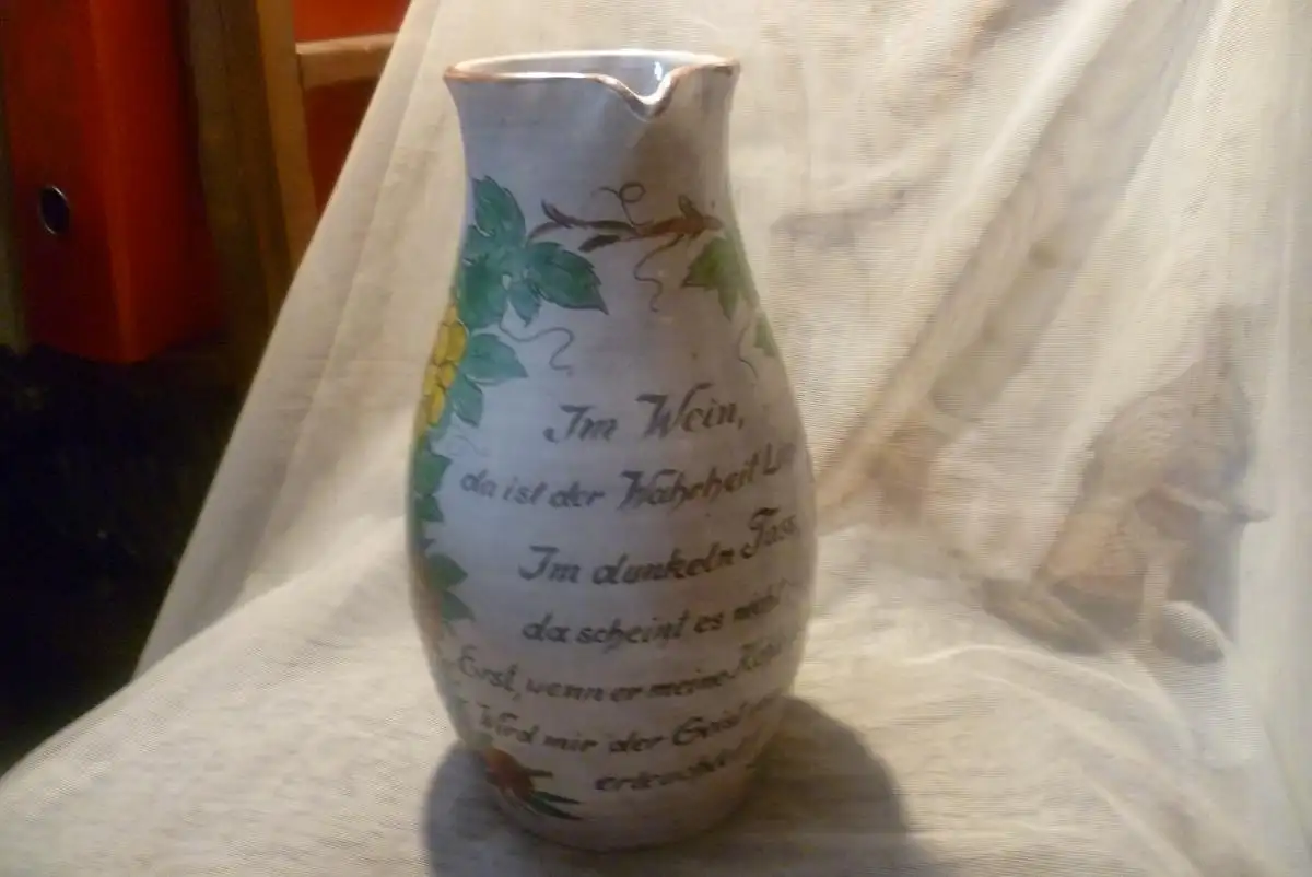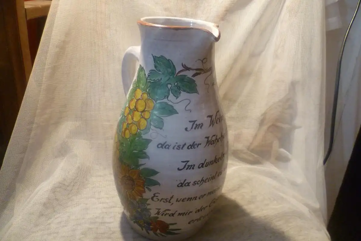 hier eine frühe Schenkkanne Hand bemalt Weinrfebenranken ..: Trinkspruch Im Wein da ist der Wahrheit Licht!