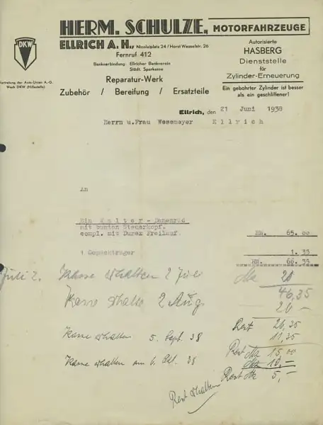 Hermann Schulze, Ellrich Rechnung Walter Damenrad von 1938