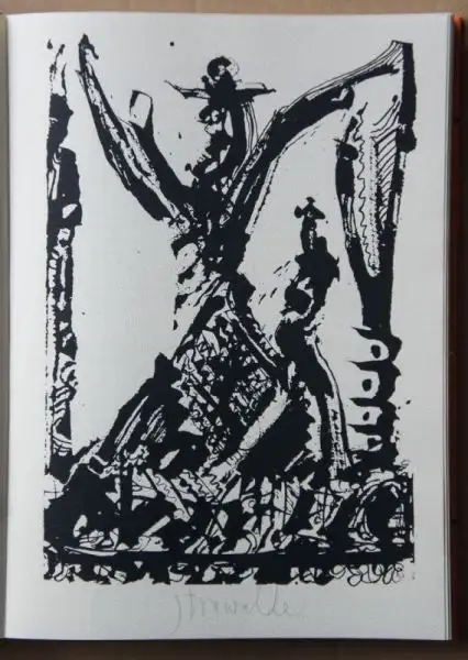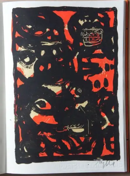 Mit Texten von Guillaume Apollinaire, Robert Desnos, Louis Aragon, Paul Éluard, Maurice Blanchot, Georges Bataille, Maurice Blanchot, Michel Leiris, Antonin Artaud, Benjamin Péret und René Char. Mit 21 beigebundenen und signierten Originalgrafiken von Klaus Zylla, Strawalde, Felix Martin Furtwängler, Michael Würzberger, Lothar Böhme, Gisela Rieffert, Sabine Jahn, Michael Jastram. Mikos Meininger und Thomas H. Weber.