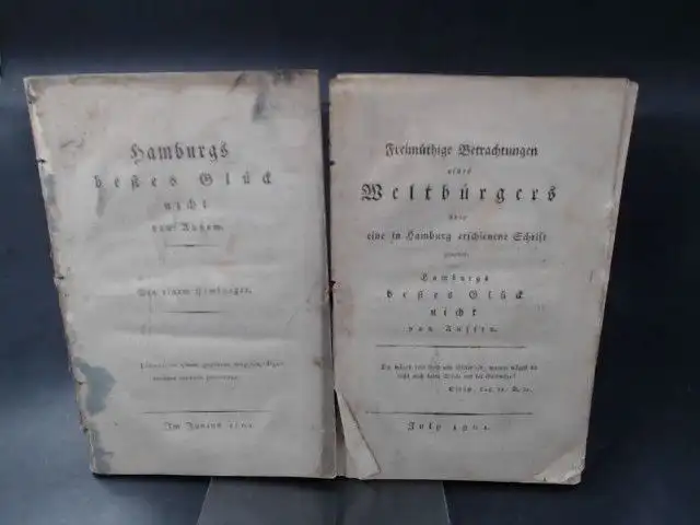 1) Hamburgs bestes Glück nicht von Außem [Außen]. Von einem Hamburger; 2) Freimütige Betrachtungen eines Weltbürgers über eine in Hamburg erschienene Schrift genannt: Hamburgs bestes Glück nicht von Aussem [Außem]. 2 Bücher (ursprünglich) zusammengebunden (Einband fehlt). 1) Papier altersgemäß gebräunt, leicht wellig, teils fleckig. Mit ca 1x1cm großer Fehlstelle auf dem Titelblatt (ohne Textverlust); 2) Papier altersgemäß gebräunt, leicht wellig, teils leichtfleckig und teils leicht knickspurig, mit wenigen Randläsuren. Die ersten 3 Blätter haben sich abgelöst. Etwas fragiler Zustand