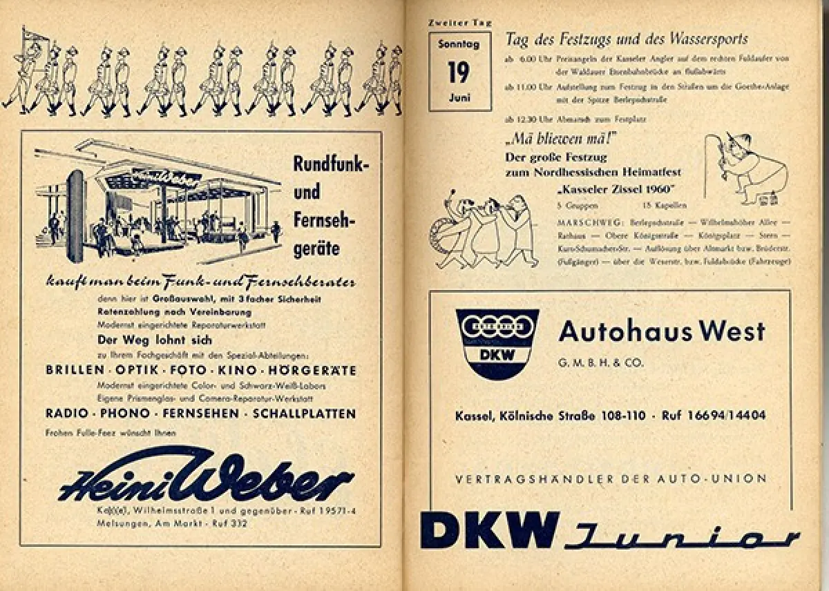 mit GESAMT 64 Seiten photographischen und druckgraphischen Abbildungen Grußworte einige Worte zur Kasseler Stadtgeschichte Festprogramm und Veranstaltungen Festzug und Sport rund um Kasseler Zissel alles flankiert von unzähligen Werbeanzeigen und Inseraten