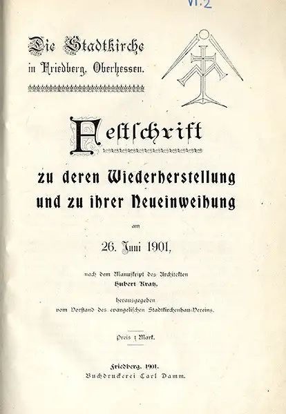 Die Stadtkirche in Friedberg Oberhessen. Festschrift zu deren Wiederherstellung und zu ihrer Neueinweihung am 26. Juni 1901. Nach dem Manuskript des Architekten Hubert Kratz herausgegeben vom Vorstand des evangelischen Stadtkirchenbau-Vereins