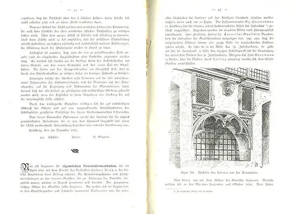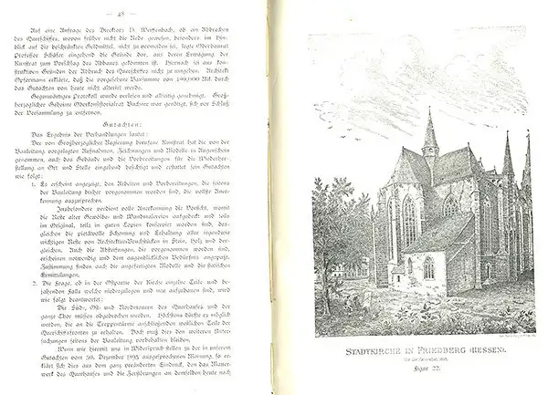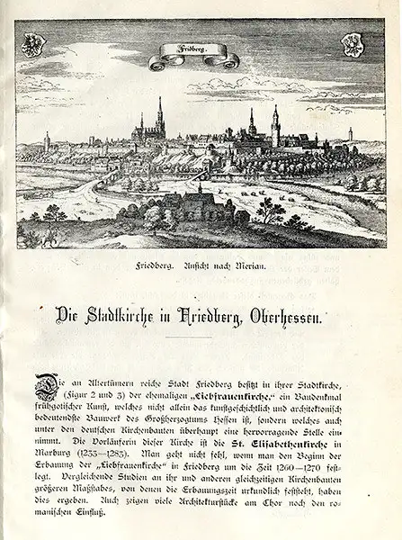 mit GESAMT 72 Seiten mit photographischen und druckgraphischen Abbildungen einem Vorwort Geschichte und Baulichkeiten der Stadtkirche Friedberg Grundriss und Baugeschichte Rekonstruktion der ursprünglichen Gestalt die verschiedenen Bauepochen die architekturhistorische Bedeutung der Kirche Planung und Organisation der Wiederherstellung Beginn und Durchführung der Arbeiten außerer und innerer Ausbau der Kirchenvorstand Denkmale und Bildwerke welche in die Stadtkirche zu Friedberg bei der Wiederherstellung wieder aufgenommen wurden usw.