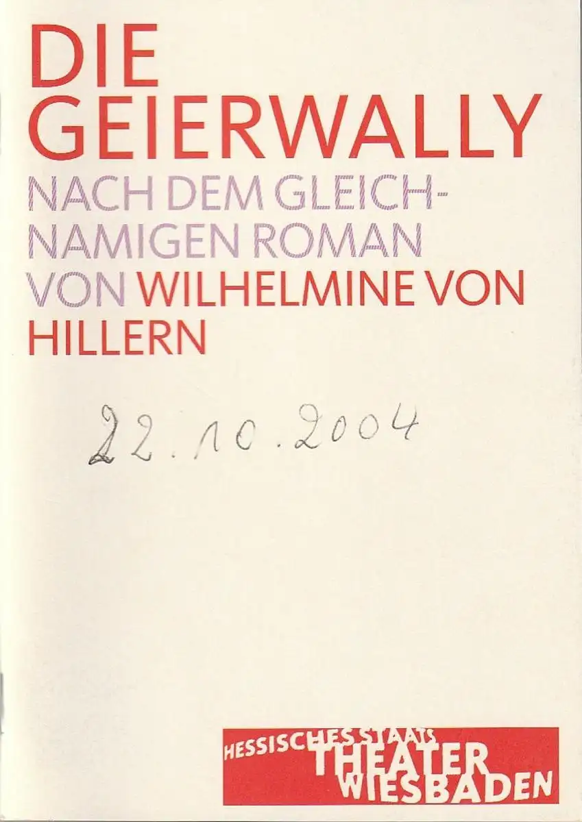 Hessisches Staatstheater Wiesbaden Schauspiel, Manfred Beilharz, Irma Dohn: Programmheft Wilhelmine von Hillern DIE GEIERWALLY Premiere 25. September 2004 Spielzeit 2004 / 05.
