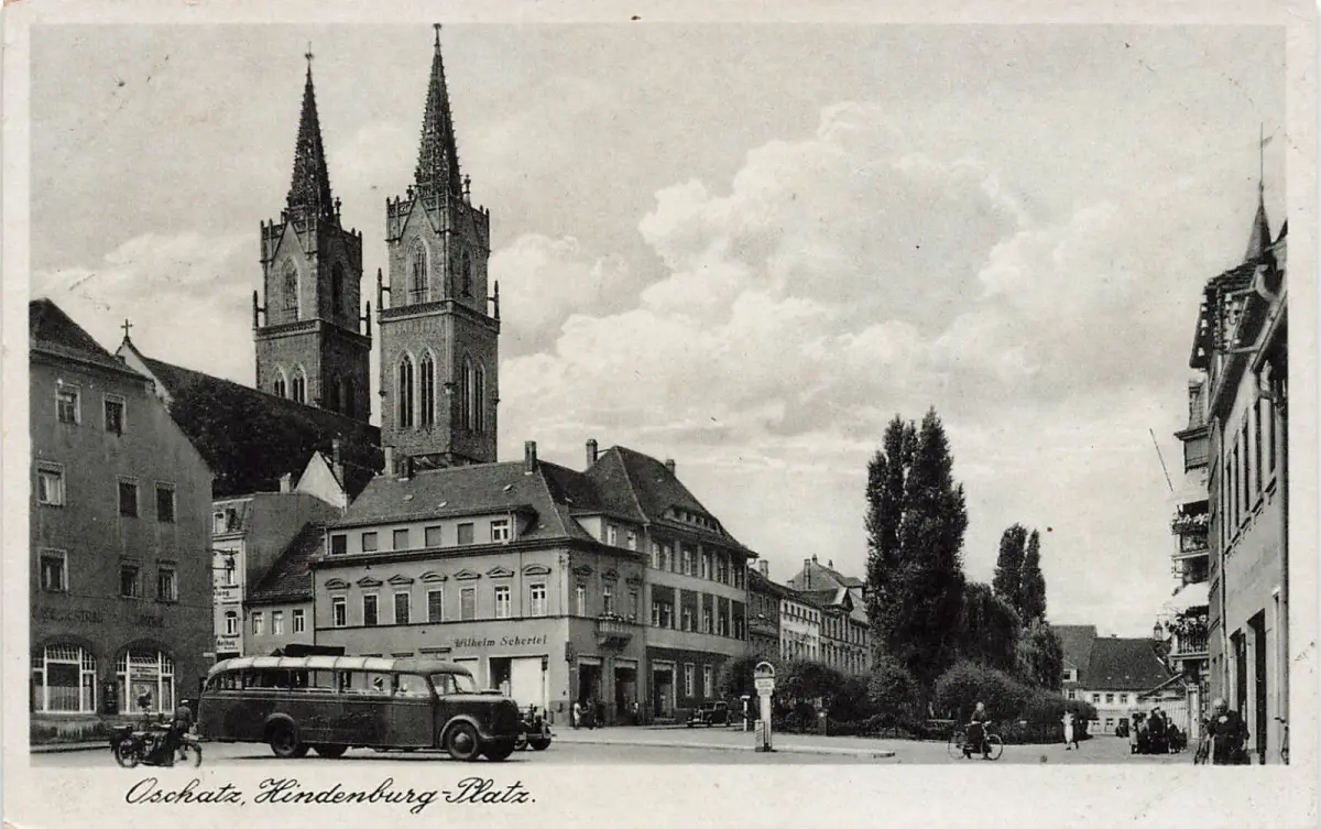 Hindenburg-Platz mit Kirche in Oschatz Sachsen Postkarte AK 1942
