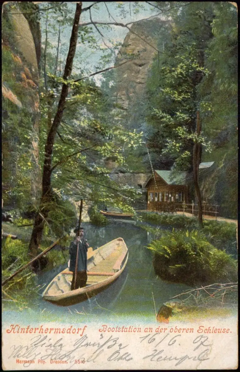 Hinterhermsdorf-Sebnitz Bootstation obere Schleuse, Kahn Schiffer 1907