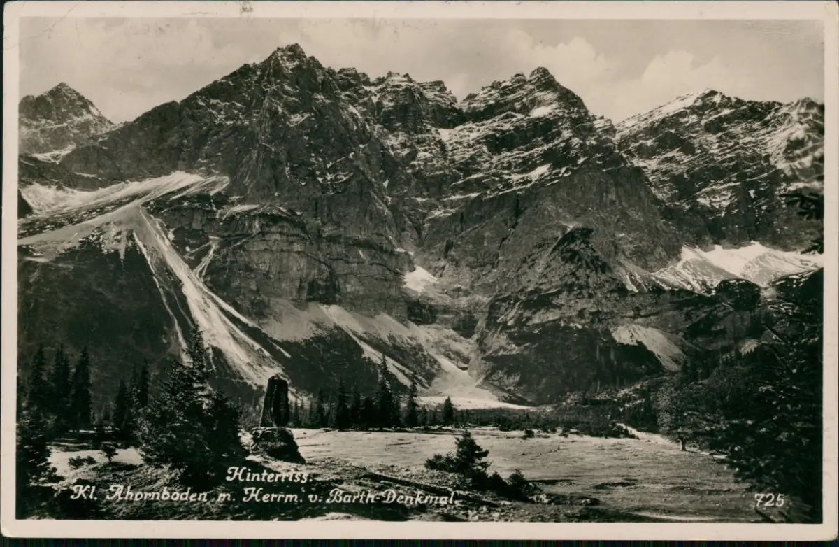 Hinterriß (Tirol) Panorama Kl. Ahornboden mit Herrm. v. Barth Denkmal 1938