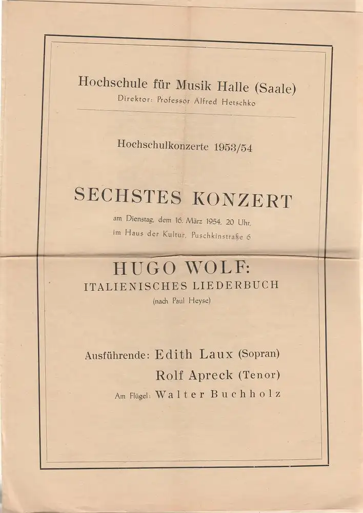 Hugo Wolf: ITALIENISCHES LIEDERBUCH nach Paul Heyse. Ausführende: Edith Laux, Rolf Apreck. Am Flügel: Walter Buchholz - Theaterprogramm, Opernprogramm, Ballettprogramm, Musicalprogramm, Konzertprogramm, Theatermemorabilia, Programmhefte Sammlung, deutsche Theatergeschichte.