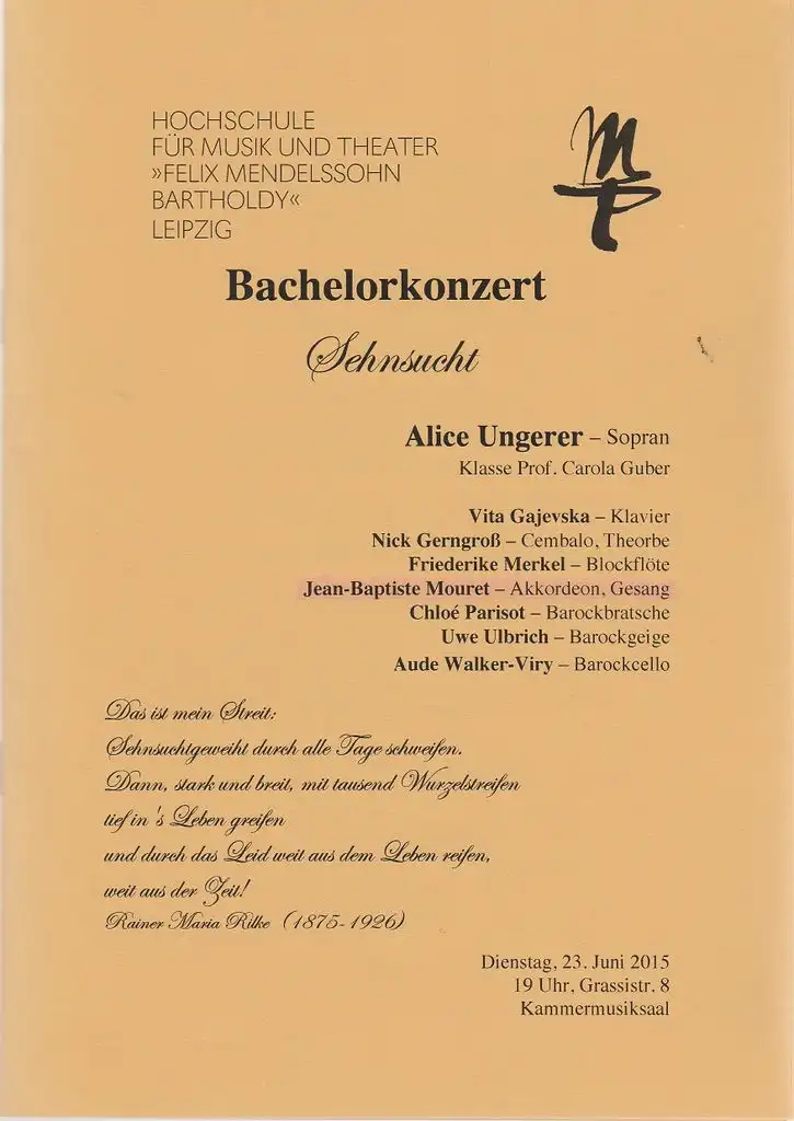 Hochschule für Musik und Theater Felix Mendelssohn-Bartholdy Leipzig: Programmheft BACHELORKONZERT SEHNSUCHT ALICE UNGERER 23. Juni 2015 Kammermusiksaal.