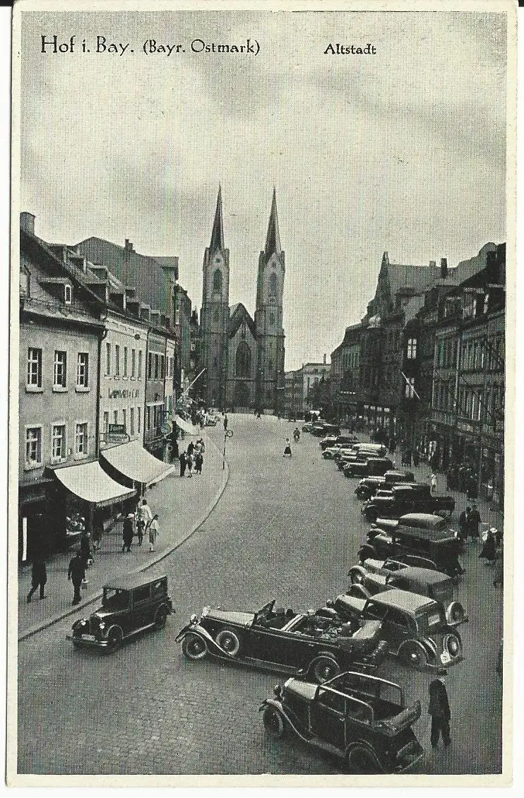 Hof, Altstadt m. Geschäften,Oldtimer u. Personen, 1942 gebr sw-AK