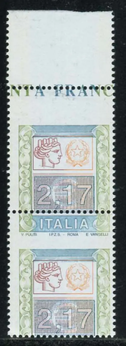 Hohe Werte 2,17 Sortenpaar Italien hoch Vollgummi - Hohe Werte 2,17 Nr. 2582 Paar b. von f. mit stark verschobenen Zahnung, so dass der Schriftzug Italien oben statt unten ist - das obere Exemplar ohne Schriftzug Italien mit Randangaben in der Vignette - Interessanter Code 600/7