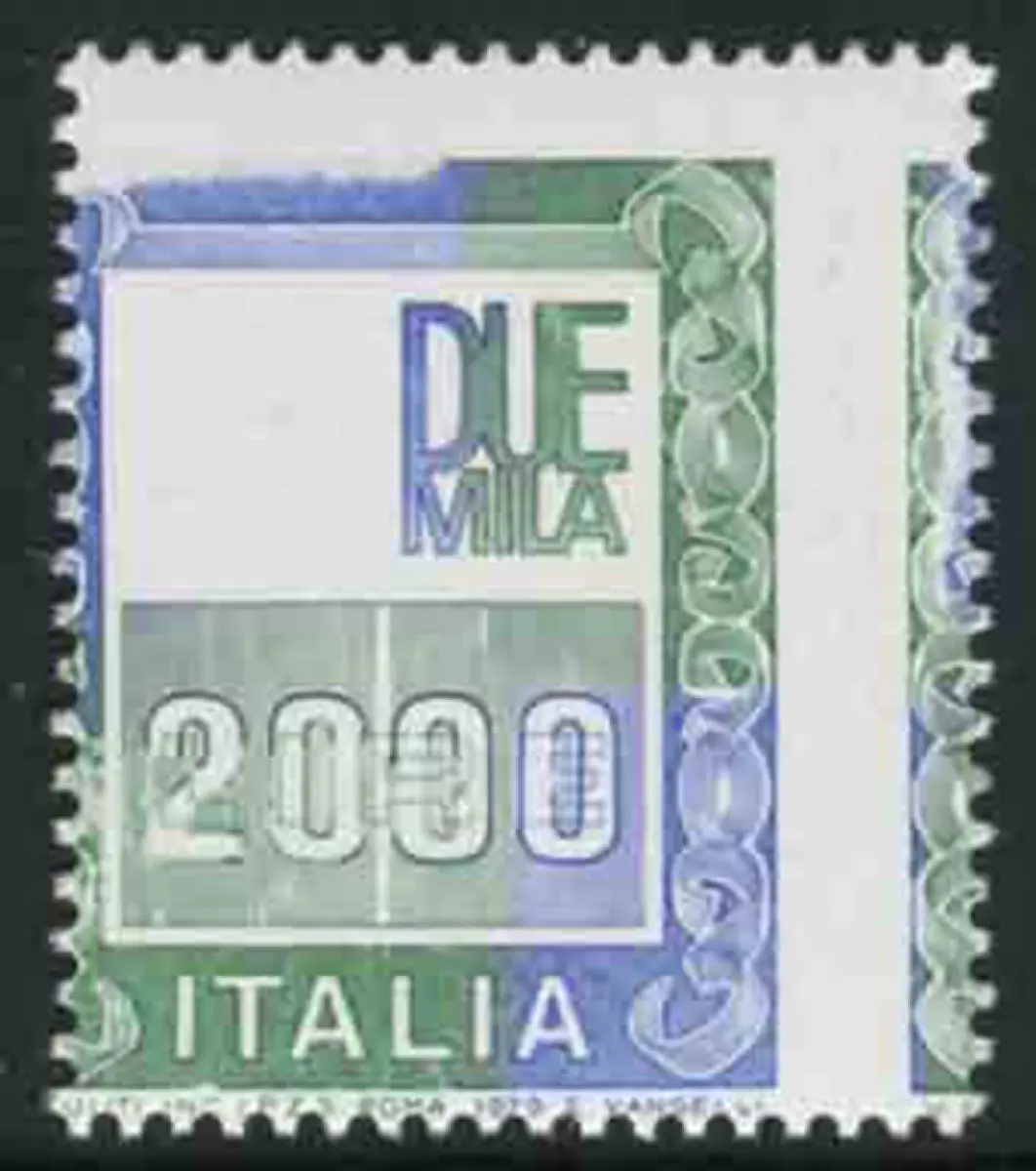 Hohe Lire-Werte 2.000 Sorten verschobene und kopflose Verzahnung Vollgummi - Hohe Lire-Werte 2.000 Nr. 1439 mit verschobener vertikaler Verzahnung, völlig fehlende Farben in der Mitte der Naturmarke Italien ohne Kopf (Kat. Bolaffi Nr. 1539B) - Selten - Zert. D. Carraro Code Nr. 502/4