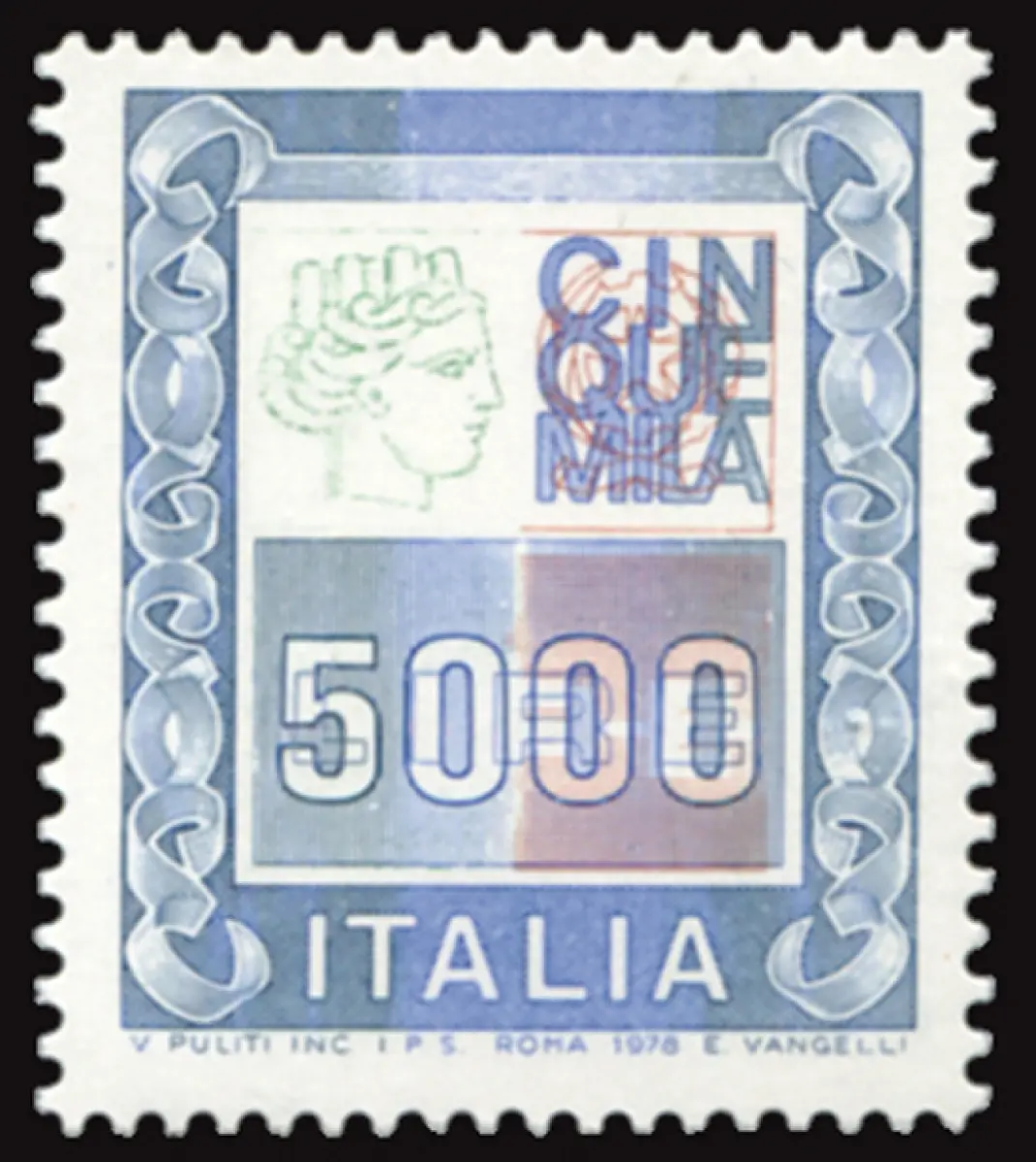 Hohe Werte Lire 5.000 Sorten Druck grün verblassender Vollgummi MNH - Hohe Werte Lire 5.000 Nr. 1442 Druck von Grün (Kopf von Syrakus) verblassend - Selten Cod. 543/16