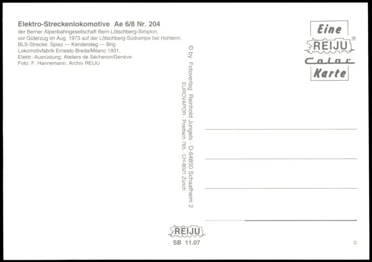 Infos: Die Postkarte zeigt die Elektro-Streckenlokomotive Ae 6/8 Nr. 204 der Berner Alpenbahngesellschaft Bern-Lötschberg-Simplon (BLS) vor einem Güterzug. Das Foto wurde im August 1973 auf der Lötschberg-Südrampe bei Hohtenn aufgenommen. Die BLS-Strecke verläuft von Spiez über Kandersteg nach Brig. Die Lokomotive wurde 1931 von der Lokomotivfabrik Ernesto Breda/Milano gebaut, die elektrische Ausrüstung stammt von Ateliers de Sécheron/Genéve. Das Foto wurde von F. Hannemann gemacht und stammt aus dem Archiv REIJU. Die Karte ist eine 'REIJU Color Karte' des Fotoverlags Reinhold Jungels, D-64850 Schaafheim 2, in Zusammenarbeit mit EUROVAPOR, CH-8021 Zürich. Die Seriennummer der Karte ist SB 11.07.