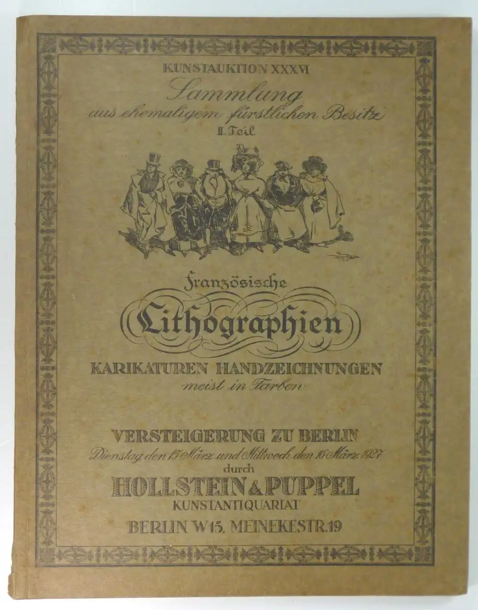 Titel: Französische Lithographien. Dabei zirka 250 komplette kolorierte Folgen und seltene meist farbige Einzelblätter von Daumier, Gavarni, Lami, Monnier u.a. Karikaturen von Cruikshank, Gillray, Rowlandsan u.a. und eine grosse Napoleonsammlung. Handzeichnungen - Dabei Werke von Delaroche, Gavarni, Monnier, Troyon u.a. Sammlung aus ehemaligem fürstlichen Besitz. Zweiter Teil. Kunstauktion XXXVI. 15.-16. März 1927