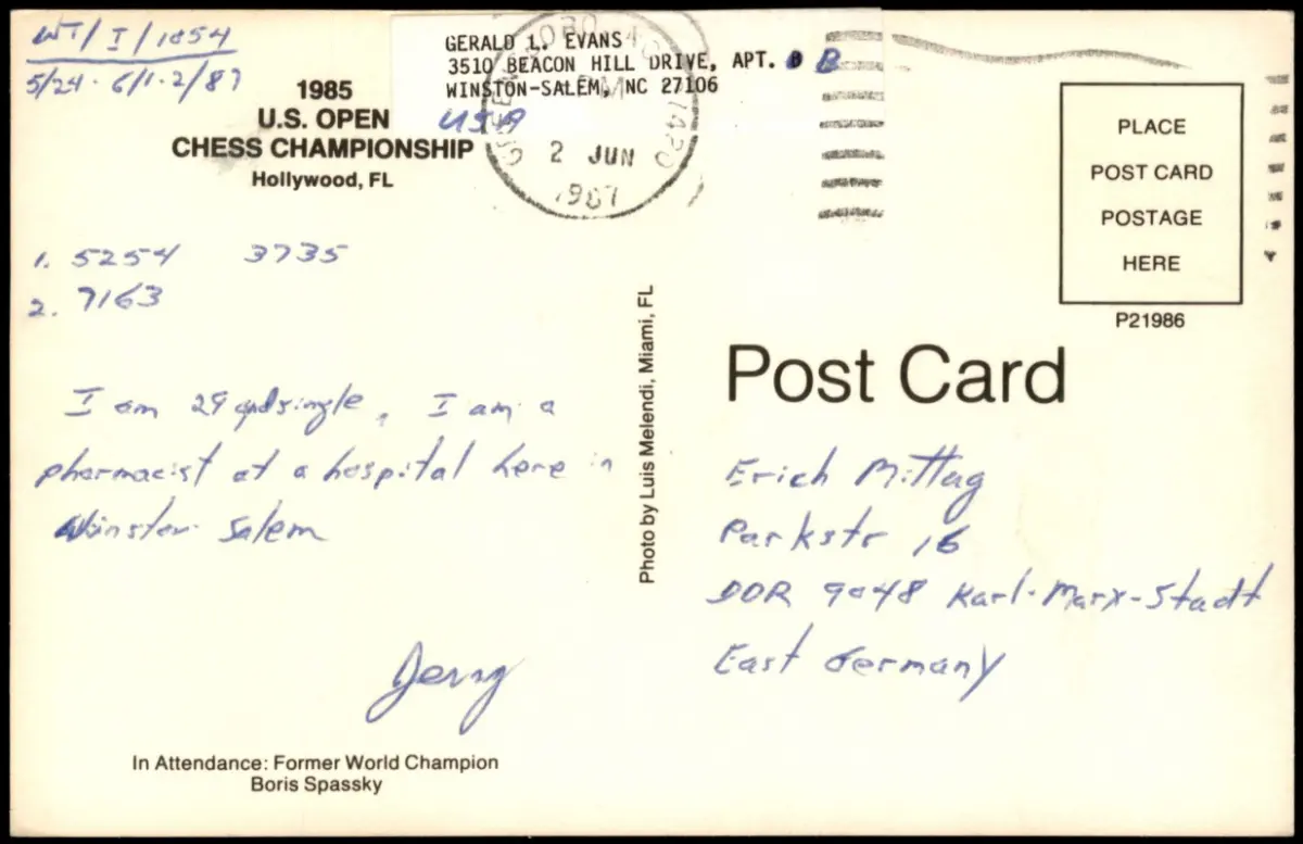 Hollywood FL Schach Motiv-Sonderkarte U.S. OPEN CHESS CHAMPIONSHIP Diplomat Hotel 1985