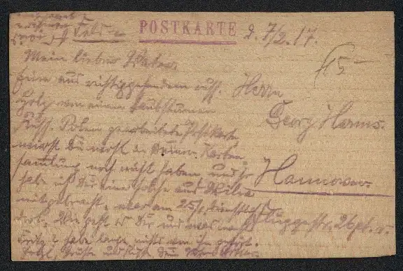 Personenbezogene Daten auf der Rückseite der Karte wurden durch blauen Textmarker unkenntlich gemacht. Die blauen Stellen sind auf die Vorderseite durchgeweicht und wirken sich negativ auf das Postkartenfoto aus