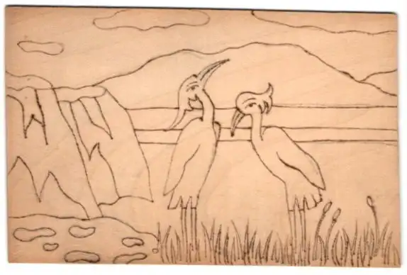 Holz-AK Zeichnung von zwei Reihern an einem Strand