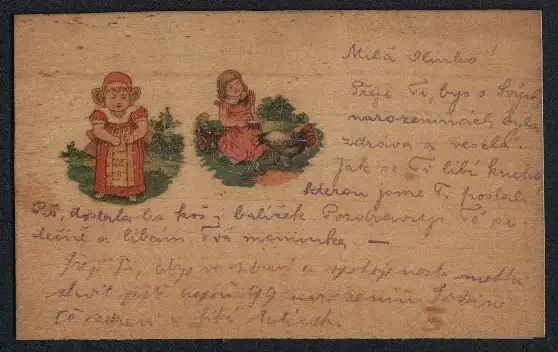 Holz-AK Zwei junge Mädchen in Kleidern auf der Wiese, eines mit einem Huhn