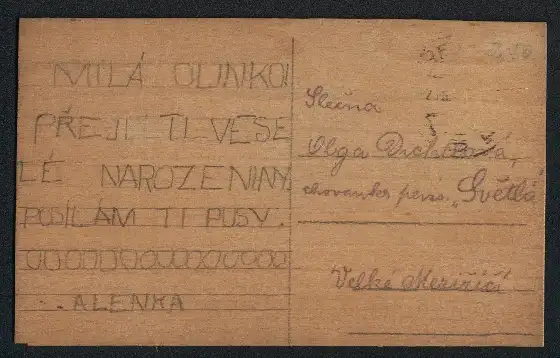Personenbezogene Daten auf der Rückseite der Karte wurden durch blauen Textmarker unkenntlich gemacht. Die blauen Stellen sind auf die Vorderseite durchgeweicht und wirken sich negativ auf das Postkartenfoto aus