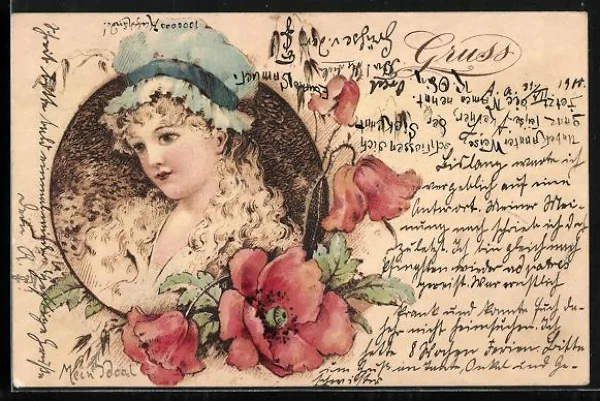 Holzbrand-Imitations-AK Blondes Fräulein mit Haube, Mohnblumen