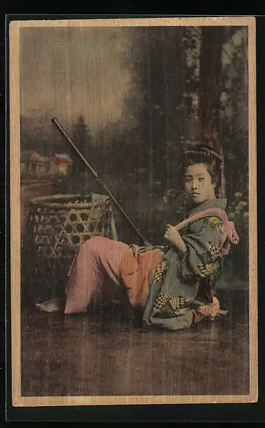 Holzbrand-Imitations-AK Frau in bunter Kleidung mit geflochtenem Korb