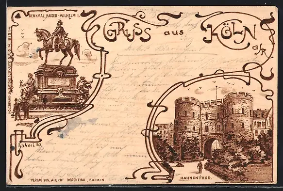 Holzbrand-Imitations-AK Köln a. R., Hahnentor, Denkmal Kaiser-Wilhelm I.