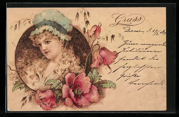 Holzbrand-Imitations-AK Mädchen mit Haube und Roter Mohn