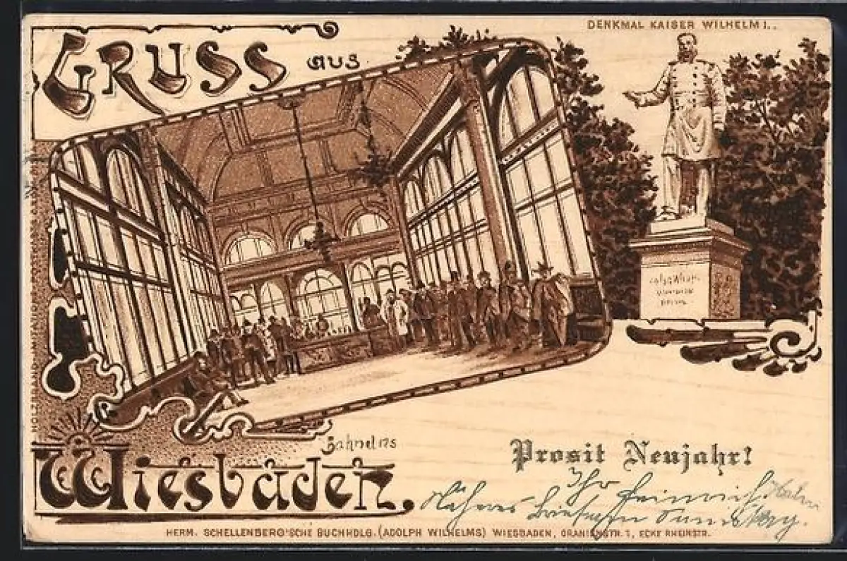 Holzbrand-Imitations-AK Wiesbaden, Denkmal Kaiser Wilhelm I